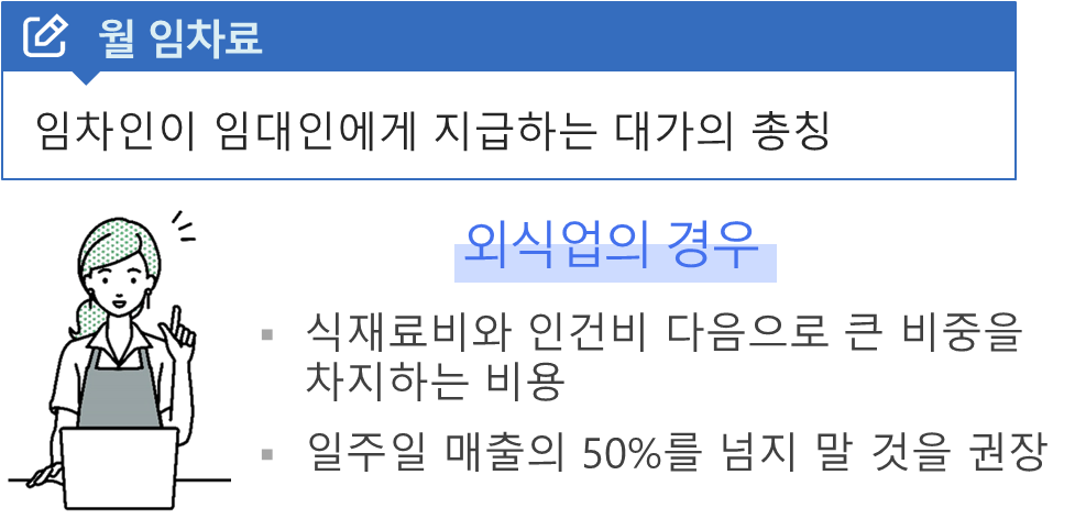 일반적으로 계약일로부터 1개월 이후부터 임차인이 임대인에게 지불하게 되는 점포의 사용대가로 외식사업자의 경우 식재료비와 인건비 다음으로 큰 비중을 차지하는 비용인데요